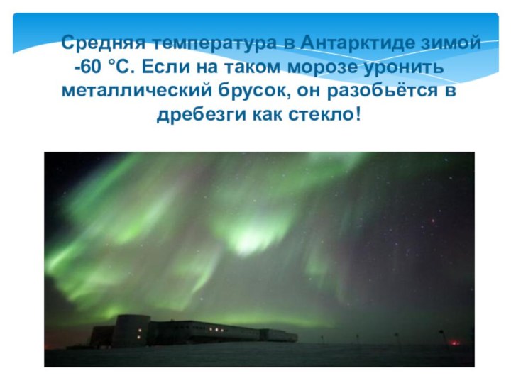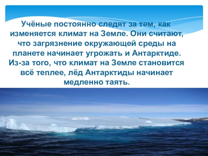 на планете начинает угрожать и Антарктиде. Из-за того, что климат на Земле становится всё теплее, лёд Антарктиды начинает медленно таять.