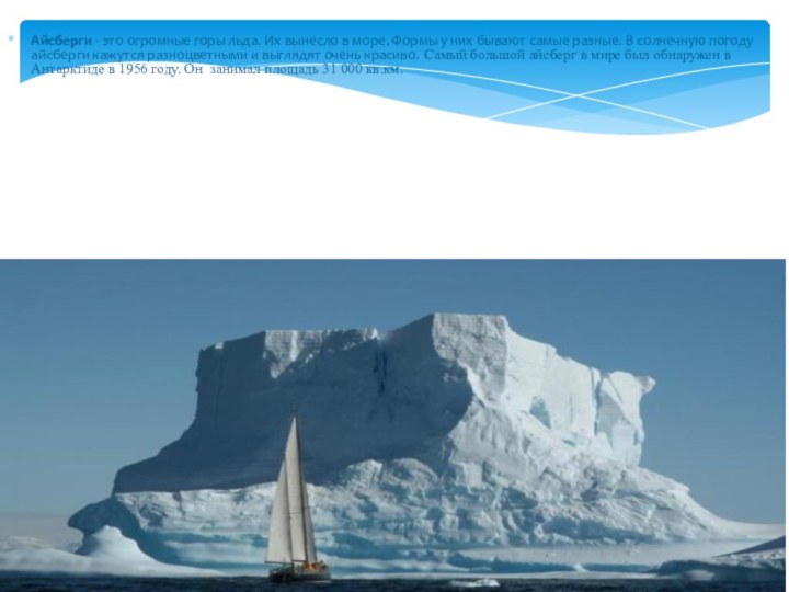 солнечную погоду айсберги кажутся разноцветными и выглядят очень красиво. Самый большой айсберг в мире был обнаружен в Антарктиде в 1956 году. Он занимал площадь 31 000 кв.км.