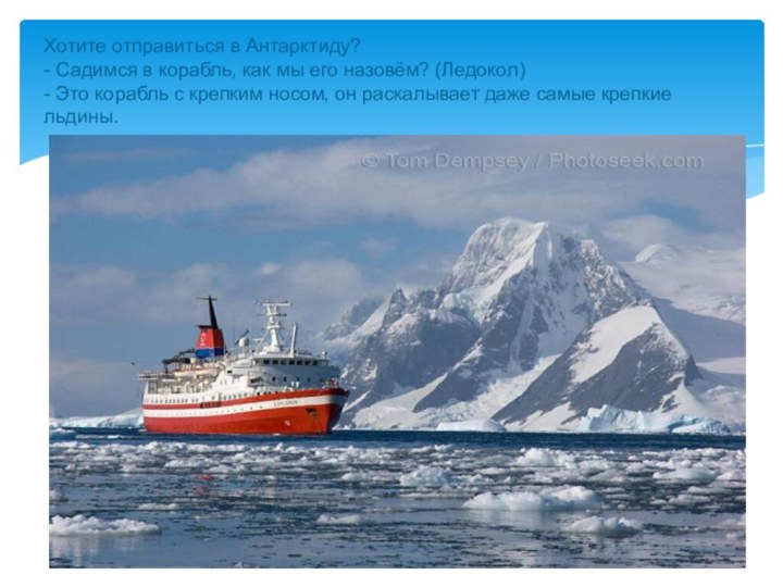 Хотите отправиться в Антарктиду? - Садимся в корабль, как мы его назовём? (Ледокол) - Это корабль с крепким носом, он раскалывает даже самые крепкие льдины.