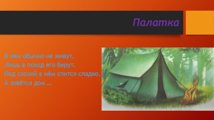 Палатка В нем обычно не живут, Лишь в поход его берут.Под