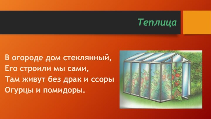 Теплица В огороде дом стеклянный,Его строили мы сами,Там живут без драк и ссоры Огурцы и помидоры.