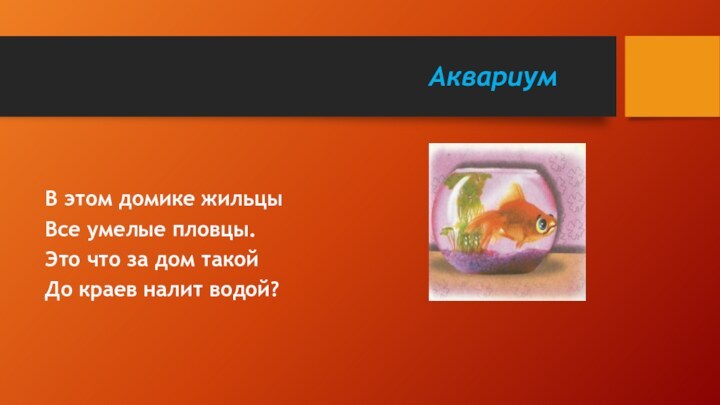 АквариумВ этом домике жильцыВсе умелые пловцы.Это что за дом такой До краев налит водой?