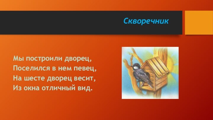 СкворечникМы построили дворец, Поселился в нем певец,На шесте дворец весит,Из окна отличный вид.