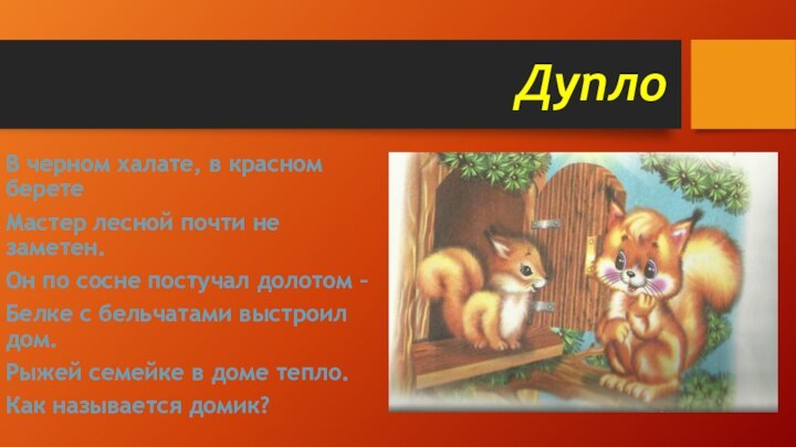 ДуплоВ черном халате, в красном беретеМастер лесной почти не заметен.Он по