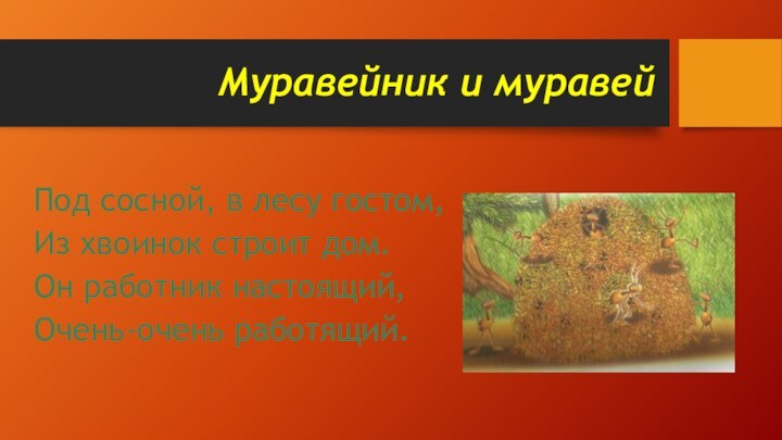 Муравейник и муравей Под сосной, в лесу гостом,Из хвоинок строит дом.Он работник настоящий,Очень-очень работящий.