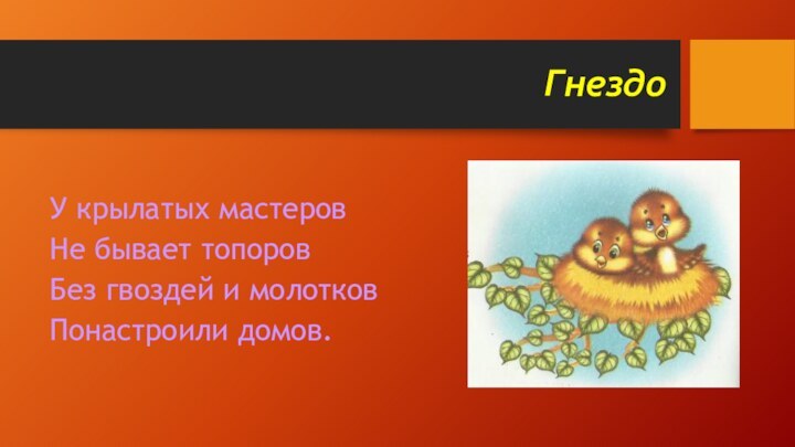 ГнездоУ крылатых мастеровНе бывает топоровБез гвоздей и молотковПонастроили домов.