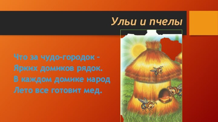 Ульи и пчелыЧто за чудо-городок –Ярких домиков рядок.В каждом домике народЛето все готовит мед.
