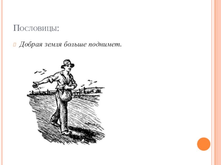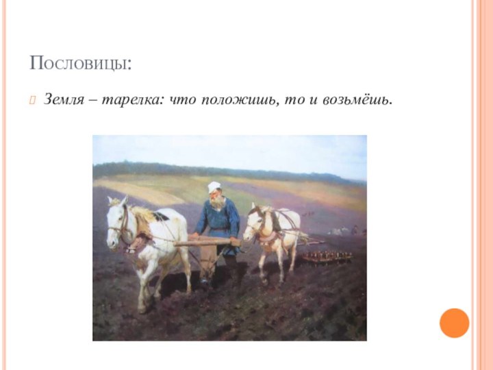 Пословицы:Земля – тарелка: что положишь, то и возьмёшь.