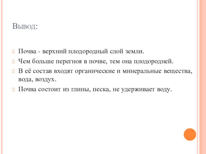 Вывод:Почва - верхний плодородный слой земли. Чем больше перегноя в почве,