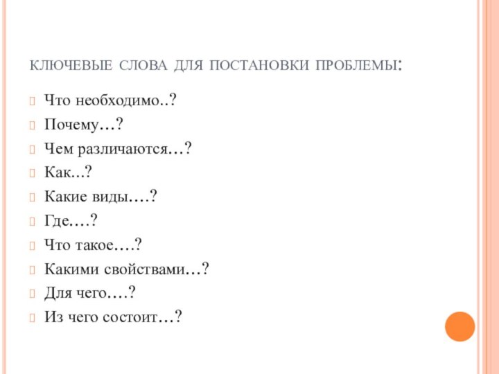 ключевые слова для постановки проблемы:Что необходимо..?Почему…?Чем различаются…?Как...?Какие виды….?Где….?Что такое….?Какими свойствами…?Для чего….?Из чего состоит…?