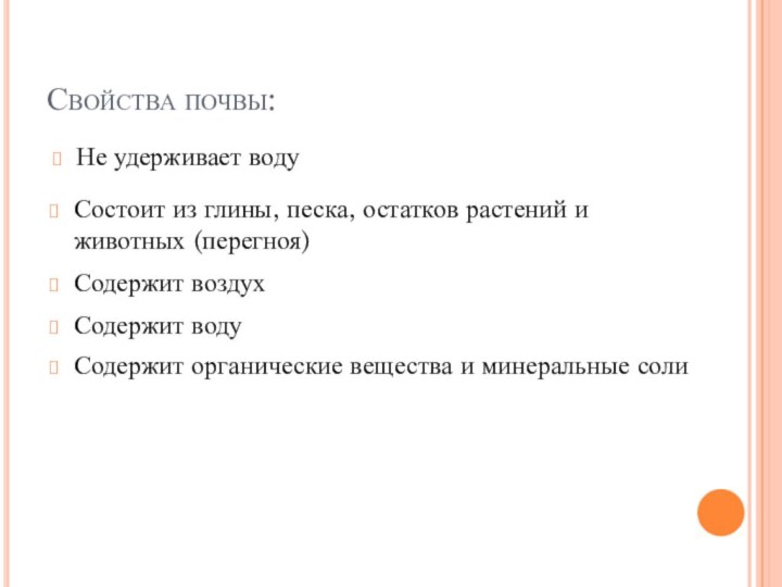 Свойства почвы:Не удерживает водуСостоит из глины, песка, остатков растений и животных