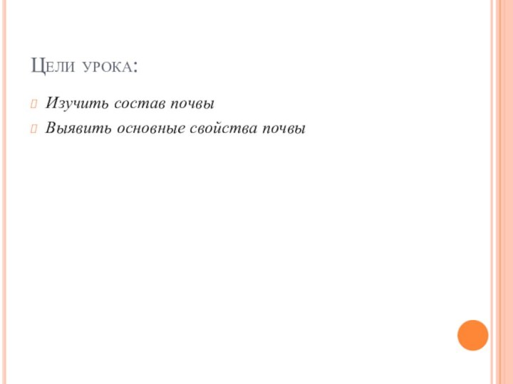 Цели урока:Изучить состав почвыВыявить основные свойства почвы