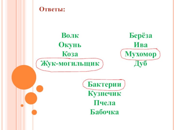 ВолкОкуньКозаЖук-могильщикОтветы: БерёзаИваМухоморДуб Бактерии КузнечикПчелаБабочка