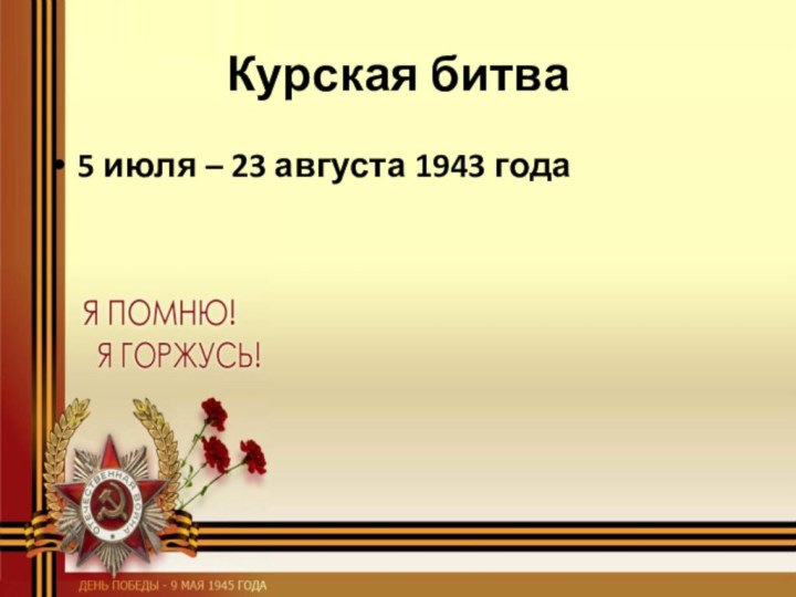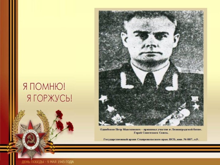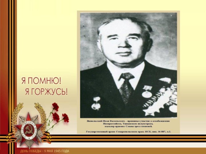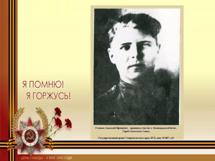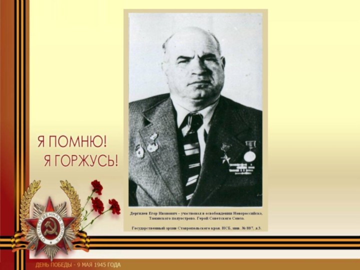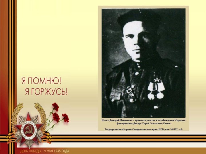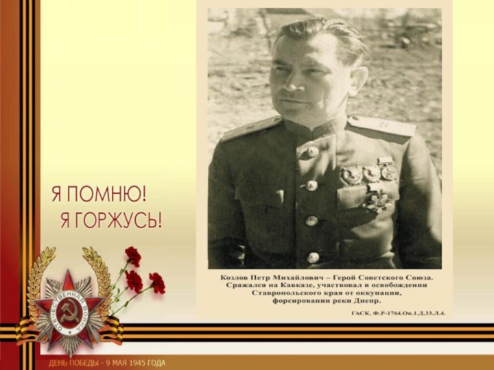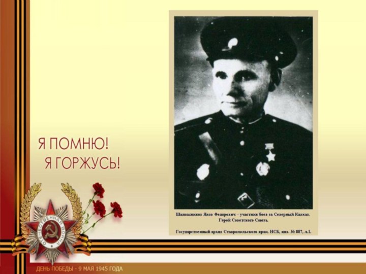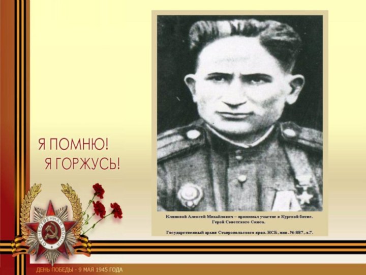 Ставропольцы в битвах Великой Отечественной войны Битва за Ленинград10 июля 1941 года – 9 августа 1944 года Битва за Москву30 сентября 1941 года – 20 апреля 1942 года Оборона и освобождение Севастополя12 сентября 1941 года – 12 мая 1944 года Сталинградская битва(17 июля 1942 года – 2 февраля 1943 года) Битва за Кавказ25 июля 1942 года – 9 октября 1943 года Курская битва5 июля – 23 августа 1943 года Бои за Днеправгуст – декабрь 1943 года Интернет ресурсыКлипарт. 9 мая http://www.liveinternet.ru/users/5397786/post323849982/ Клипарт. Я помню! Я горжусь! http://www.look.com.ua/pic/201209/1600x1200/look.com.ua-25907.jpg