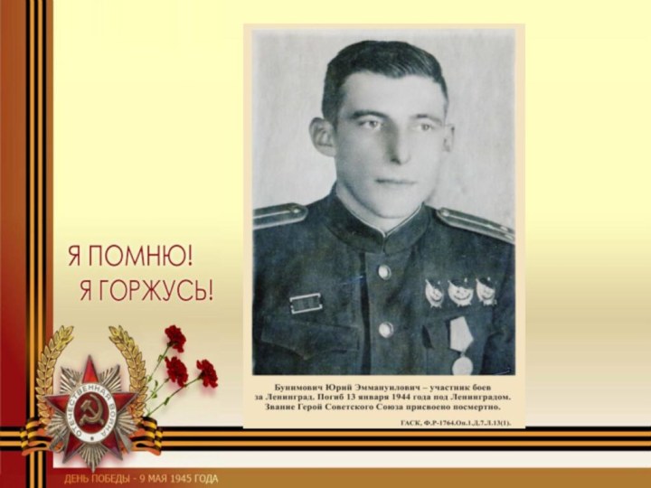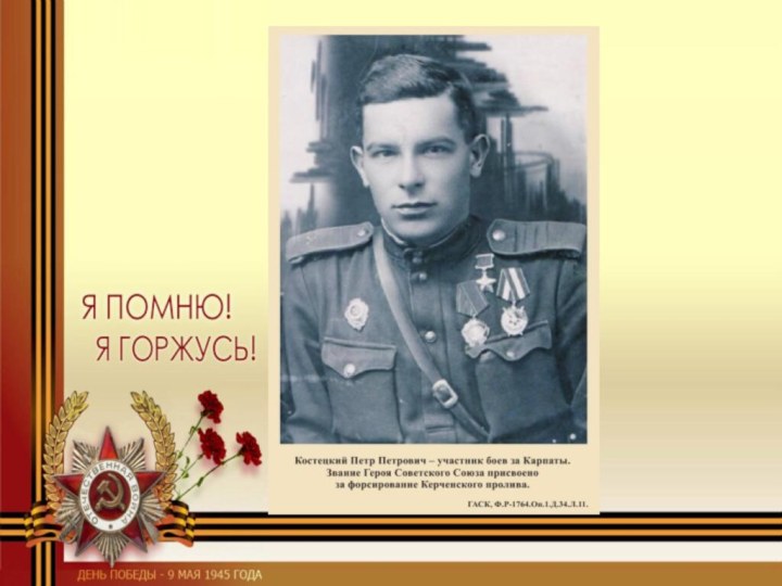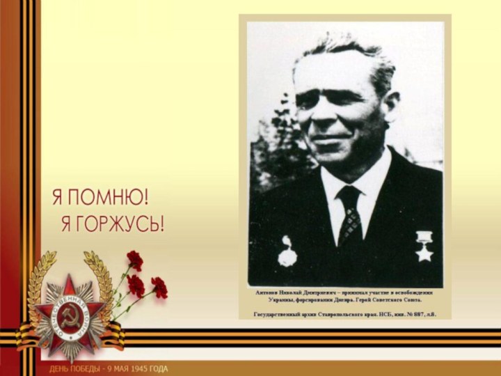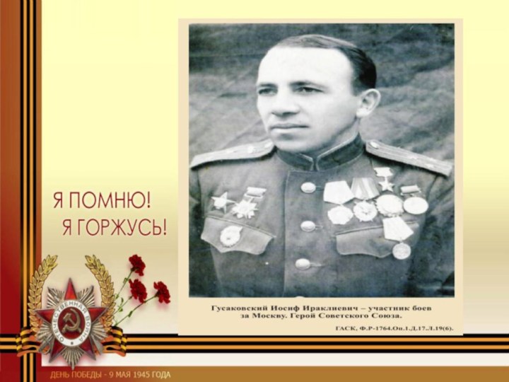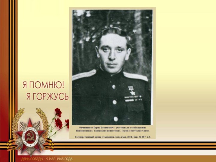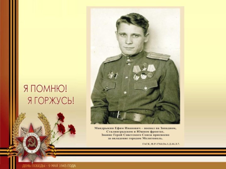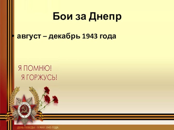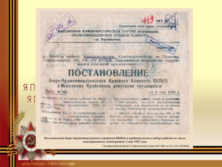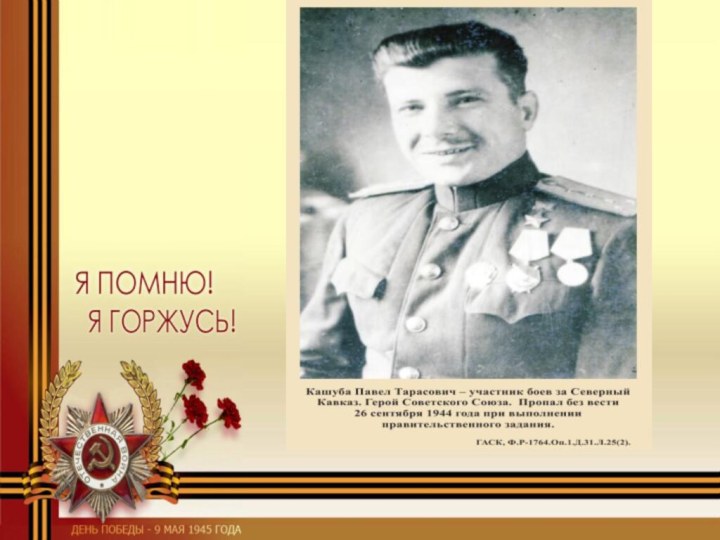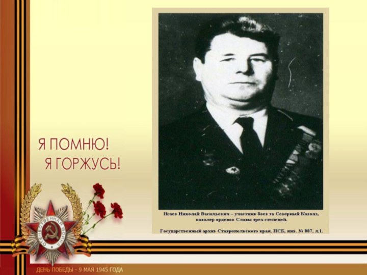 Ставропольцы в битвах Великой Отечественной войны Битва за Ленинград10 июля 1941 года – 9 августа 1944 года Битва за Москву30 сентября 1941 года – 20 апреля 1942 года Оборона и освобождение Севастополя12 сентября 1941 года – 12 мая 1944 года Сталинградская битва(17 июля 1942 года – 2 февраля 1943 года) Битва за Кавказ25 июля 1942 года – 9 октября 1943 года Курская битва5 июля – 23 августа 1943 года Бои за Днеправгуст – декабрь 1943 года Интернет ресурсыКлипарт. 9 мая http://www.liveinternet.ru/users/5397786/post323849982/ Клипарт. Я помню! Я горжусь! http://www.look.com.ua/pic/201209/1600x1200/look.com.ua-25907.jpg