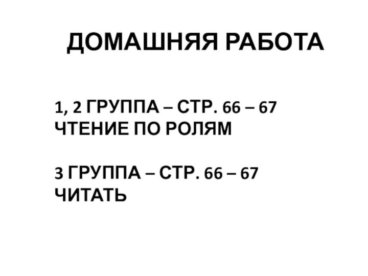 ДОМАШНЯЯ РАБОТА1, 2 ГРУППА – СТР. 66 – 67 ЧТЕНИЕ ПО