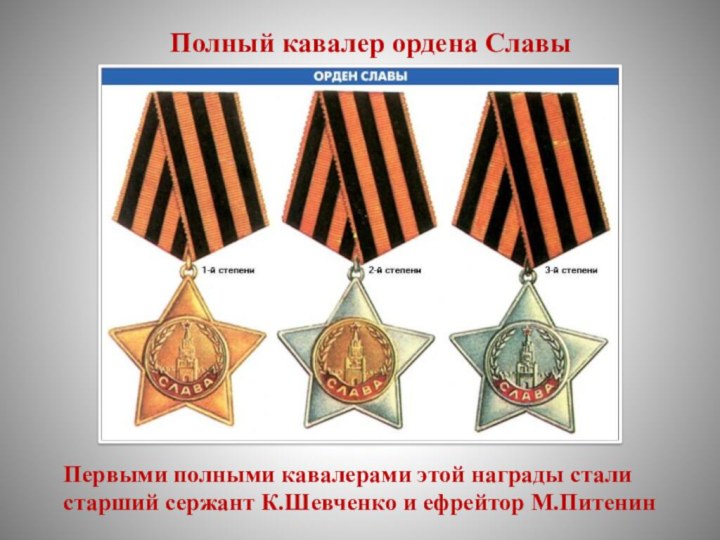 Полный кавалер ордена СлавыПервыми полными кавалерами этой награды стали старший сержант К.Шевченко и ефрейтор М.Питенин