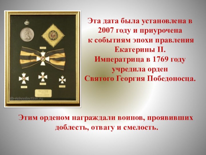 День Героев ОтечестваPrezentacii.com 9 декабря отмечается День Героев Отечества.В этот день чествуют Героев Советского Союза, Эта дата была установлена в 2007 году и приурочена к событиям эпохи Символ ордена – всадник, сидящий на белом коне, поражающий копьём дракона, - Екатерина II удостоила себяэтой награды в честь учреждения ордена Георгия Победоносца Полное название ордена – Императорский Военный орден Святого Великомученика и Победоносца ГеоргияОрден Девиз ордена: «За службу и Храбрость»Орден состоит из знаков: золотого креста, ленты Полные кавалеры ордена, то есть имеющие все четыре степени – это четверо Михаил Илларионович Голенищев-КутузовПервый полный кавалер ордена Святого ГеоргияРусский полководец, генерал-фельдмаршал,святейший князь,герой Отечественной войны 1812 года. Михаил БогдановичБарклай-де-Толли Полный кавалер ордена Святого ГеоргияВыдающийся российский полководец, генерал-фельдмаршал,военный министр, князь, Героизм советских людей в бояхс фашистами оказался массовым.Появилась необходимость установить новую награду.Этот Орден Славы I степениОрден Cлавы II степениОрден Славы III степениЗнак ордена I Полный кавалер ордена СлавыПервыми полными кавалерами этой награды стали старший сержант К.Шевченко и ефрейтор М.Питенин Сергей Афанасьевич Макаров - первый георгиевский кавалер Российской Федерации в 2008 годуС.А.Макаров НаградыОрден Святого Георгия IV степени – за мужество, отвагу и самоотверженность, проявленные Есть высшее счастье на свете,Любовь и надежду храня,Оставить свой след на планетеВо