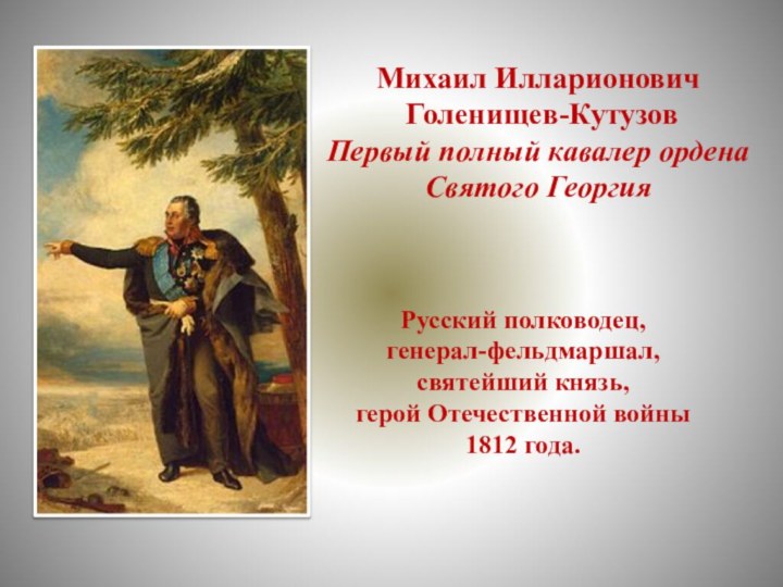 Михаил Илларионович Голенищев-КутузовПервый полный кавалер ордена Святого ГеоргияРусский полководец, генерал-фельдмаршал,святейший князь,герой Отечественной войны 1812 года.
