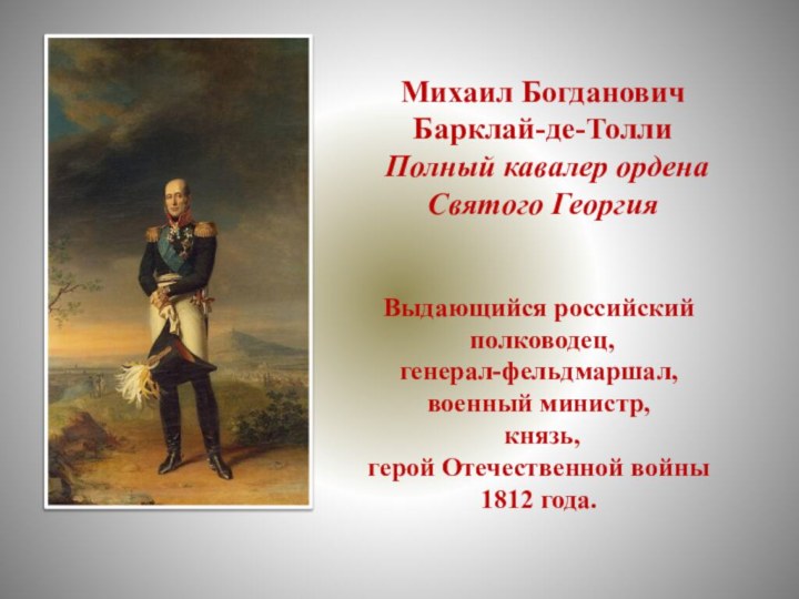 Михаил БогдановичБарклай-де-Толли Полный кавалер ордена Святого ГеоргияВыдающийся российский полководец, генерал-фельдмаршал,военный министр,