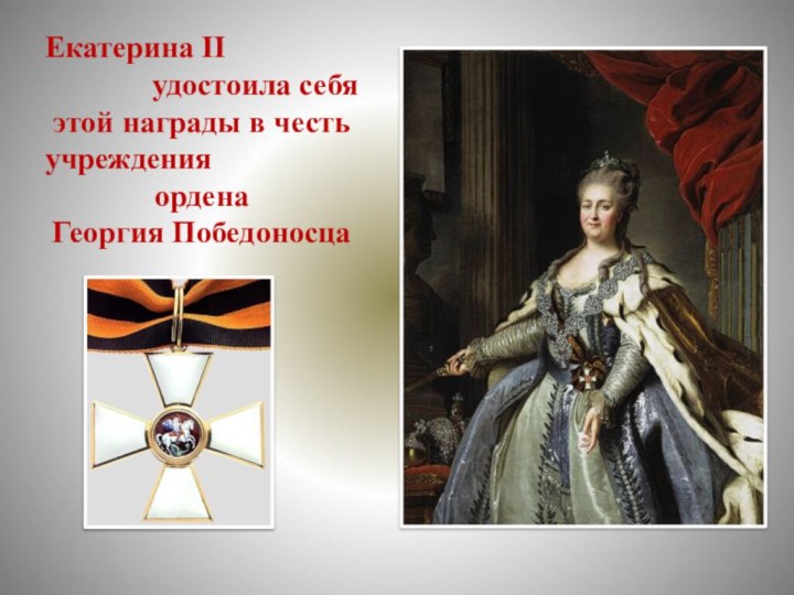 Екатерина II удостоила себяэтой награды в честь учреждения ордена Георгия Победоносца