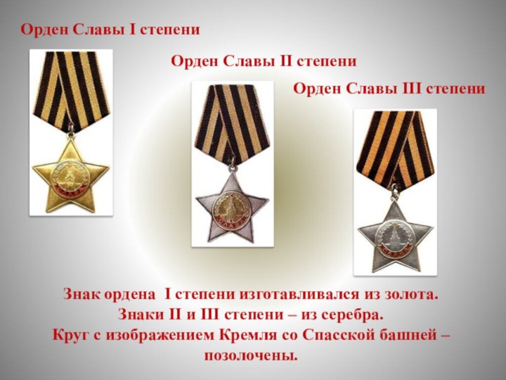 Орден Славы I степениОрден Cлавы II степениОрден Славы III степениЗнак ордена