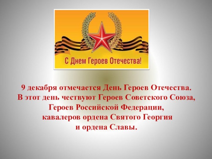 9 декабря отмечается День Героев Отечества.В этот день чествуют Героев Советского Союза, Героев Российской Федерации, кавалеров ордена Святого Георгия и ордена Славы.