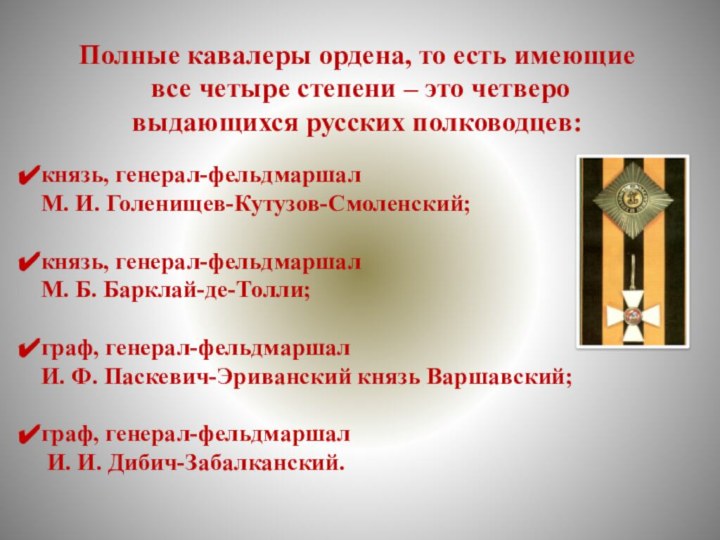 Слайд 8 Полные кавалеры ордена, то есть имеющие