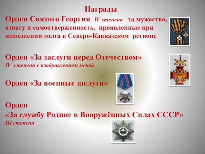 НаградыОрден Святого Георгия IV степени – за мужество, отвагу и самоотверженность,