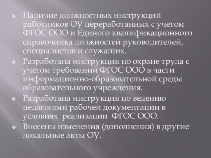 приведены в соответствие с требованиями ФГОС общего образования и новыми квалификационными характеристиками должностные инструкции работников образовательного учреждения;