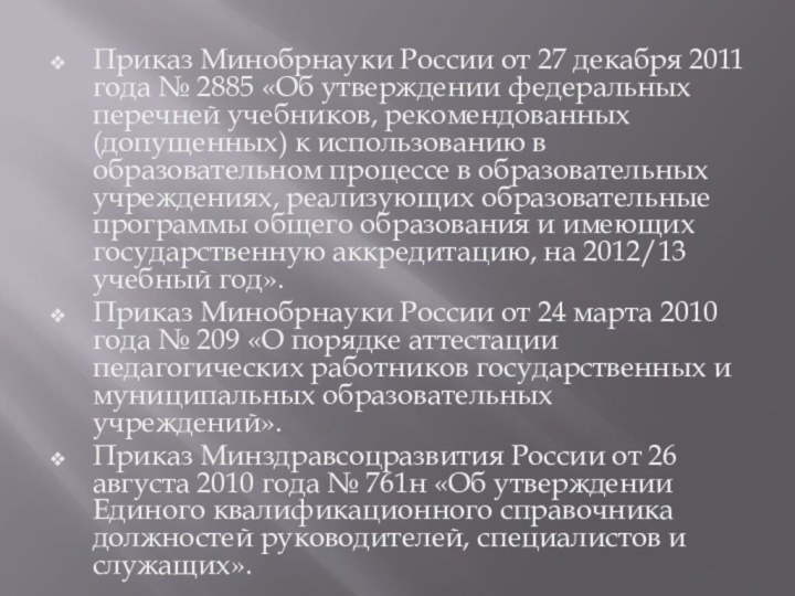 Приказ Минобрнауки России от 24 марта 2010 года № 209 «О порядке аттестации педагогических работников государственных и муниципальных образовательных учреждений».