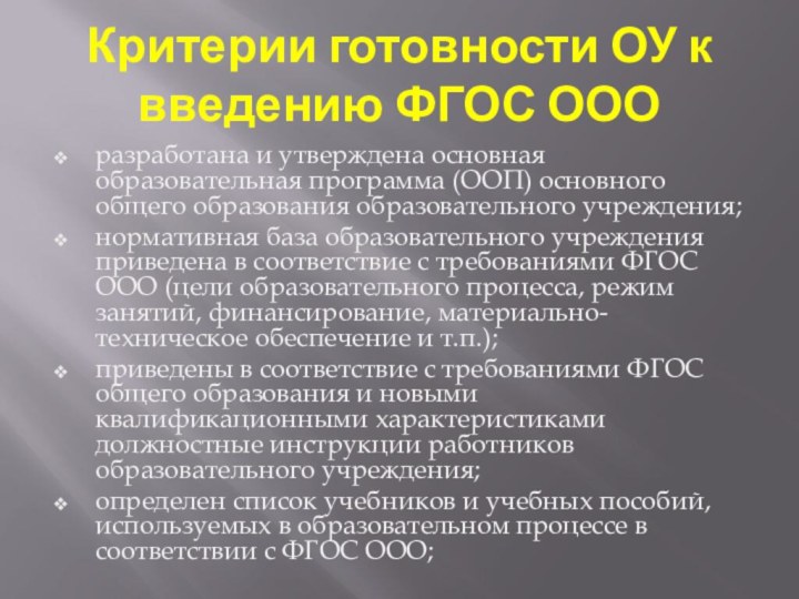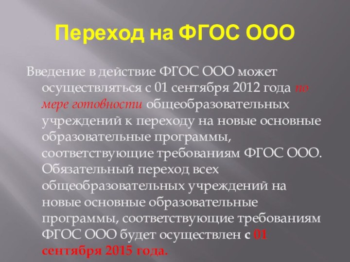 готовности общеобразовательных учреждений к переходу на новые основные образовательные программы, соответствующие требованиям ФГОС ООО. Обязательный переход всех общеобразовательных учреждений на новые основные образовательные программы, соответствующие требованиям ФГОС ООО будет осуществлен с 01 сентября 2015 года.