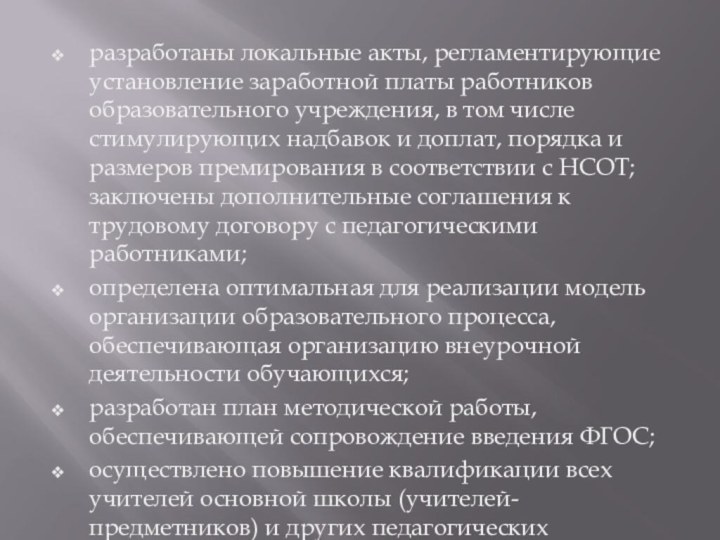 порядка и размеров премирования в соответствии с НСОТ; заключены дополнительные соглашения к трудовому договору с педагогическими работниками;
