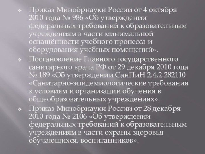 Приказ Минобрнауки России от 28 декабря 2010 года № 2106 «Об утверждении федеральных требований к образовательным учреждениям в части охраны здоровья обучающихся, воспитанников».