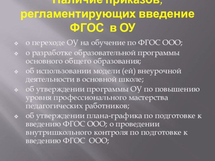 Наличие приказов, регламентирующих введение ФГОС в ОУ