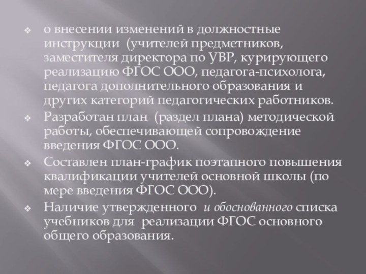 осуществлено повышение квалификации всех учителей основной школы (учителей-предметников) и других педагогических работников (возможно поэтапно по мере введения ФГОС общего образования).