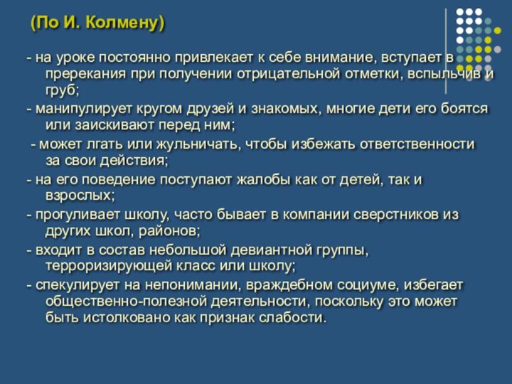 Семенюк Л.К. Психологические особенности агрессивного поведения подростков и условия его коррекции. — М.: Флинта, 1998. – С. 27.