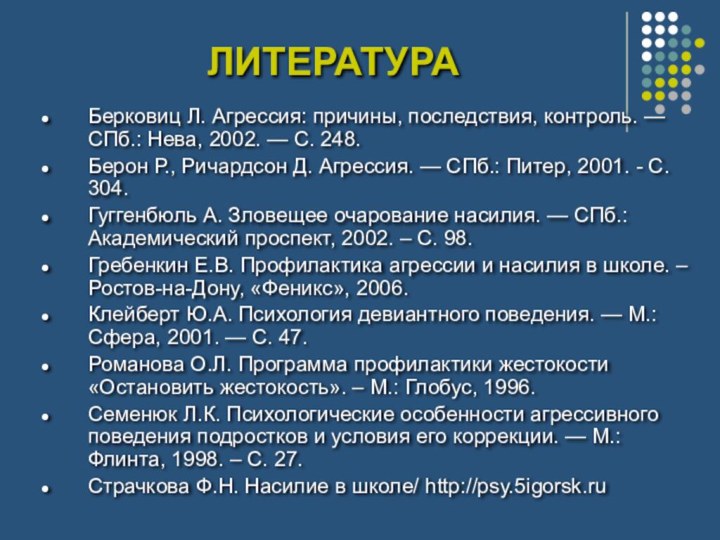 Гребенкин Е.В. Профилактика агрессии и насилия в школе. – Ростов-на-Дону, «Феникс», 2006.