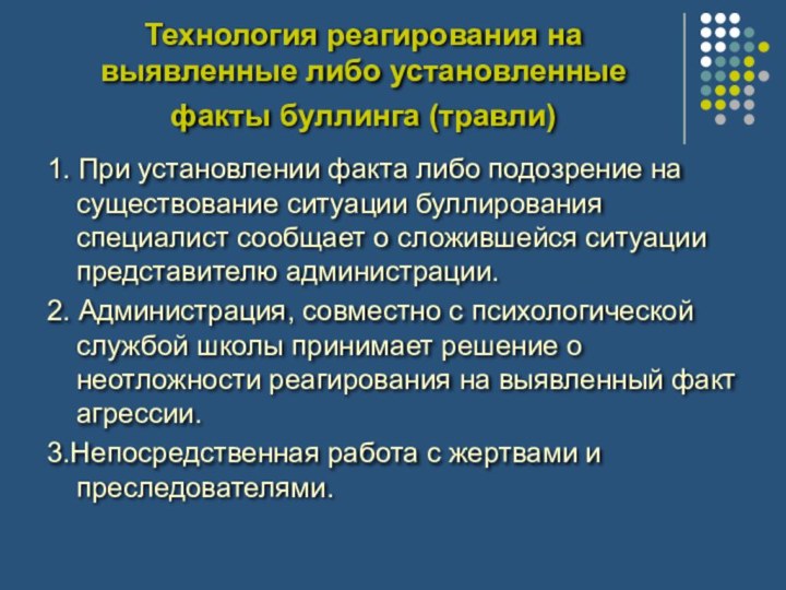 2. Администрация, совместно с психологической службой школы принимает решение о неотложности реагирования на выявленный факт агрессии.