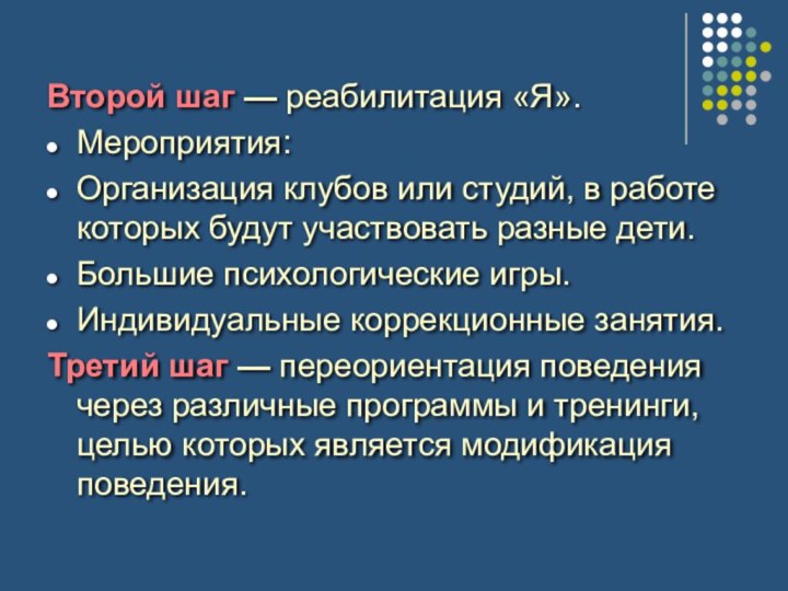 Третий шаг — переориентация поведения через различные программы и тренинги, целью которых является модификация поведения.