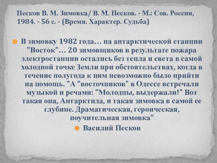 Песков В. М. Зимовка/ В. М. Песков. - М.: Сов. Россия, 1984. - 56 с. - (Время. Характер. Судьба)