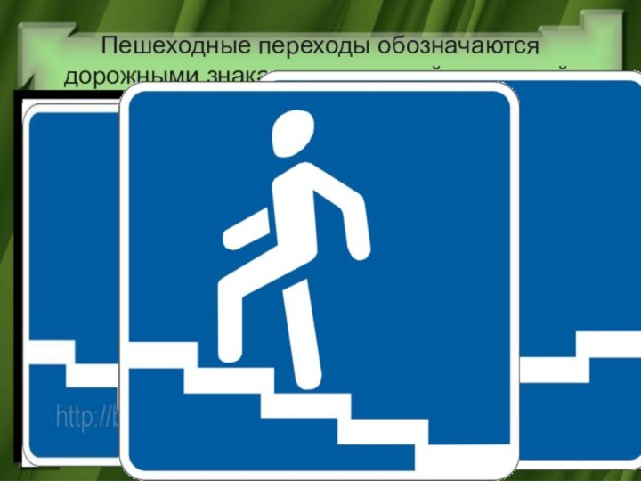 Пешеходные переходы обозначаются дорожными знаками и дорожной разметкой.