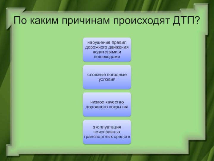 Цели: Пешеходы составляют более одной трети всех пострадавших в ДТП По каким причинам происходят ДТП? Пешеходные переходы обозначаются дорожными знаками и дорожной разметкой.
