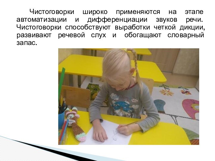 Четкая, красивая речь так необходима для полноценного общения, для успешной учебы, ребенок с правильной дикцией умеет сформулировать мысль. Материалы чистоговорок являются одним из средств повышения орфографической зоркости, применяются в коррекции нарушений, как устной речи, так и письма, т. е. использование скороговорок, ведёт к развитию учебно-познавательной деятельности, являясь одним из средств ее организации.