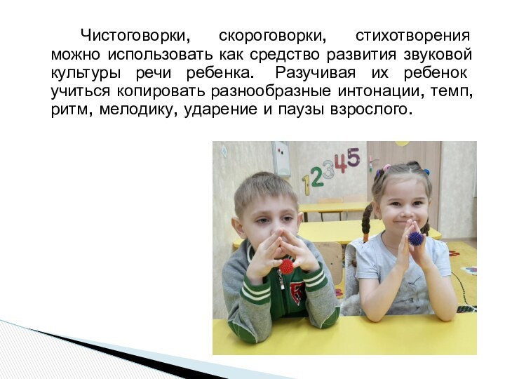 Чистоговорки, скороговорки, стихотворения можно использовать как средство развития звуковой культуры речи ребенка. Разучивая их ребенок учиться копировать разнообразные интонации, темп, ритм, мелодику, ударение и паузы взрослого.