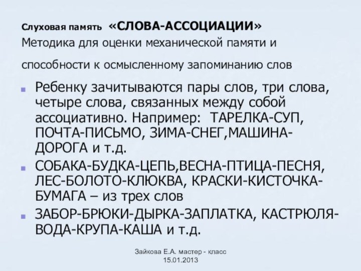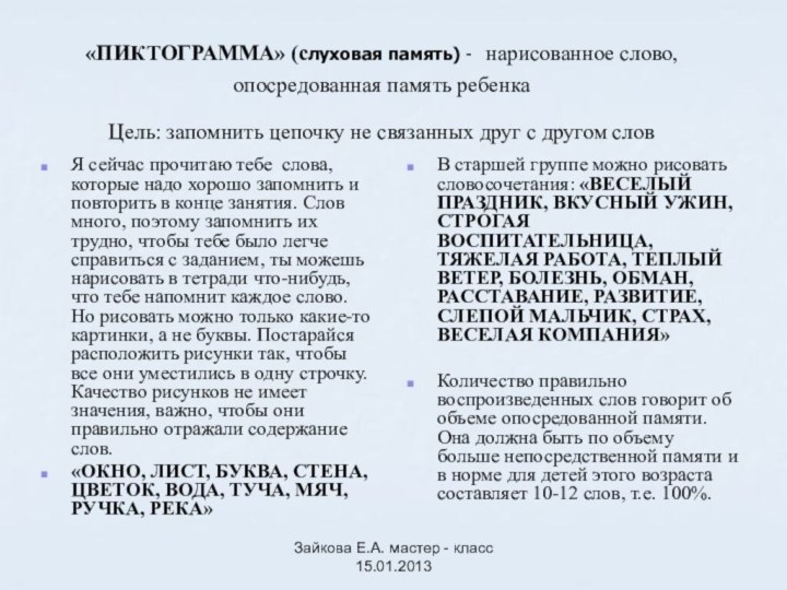 Я сейчас прочитаю тебе слова, которые надо хорошо запомнить и повторить в конце занятия. Слов много, поэтому запомнить их трудно, чтобы тебе было легче справиться с заданием, ты можешь нарисовать в тетради что-нибудь, что тебе напомнит каждое слово. Но рисовать можно только какие-то картинки, а не буквы. Постарайся расположить рисунки так, чтобы все они уместились в одну строчку. Качество рисунков не имеет значения, важно, чтобы они правильно отражали содержание слов.