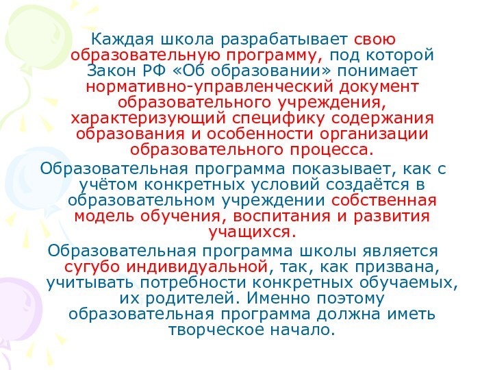 Образовательная программа школы является сугубо индивидуальной, так, как призвана, учитывать потребности конкретных обучаемых, их родителей. Именно поэтому образовательная программа должна иметь творческое начало.