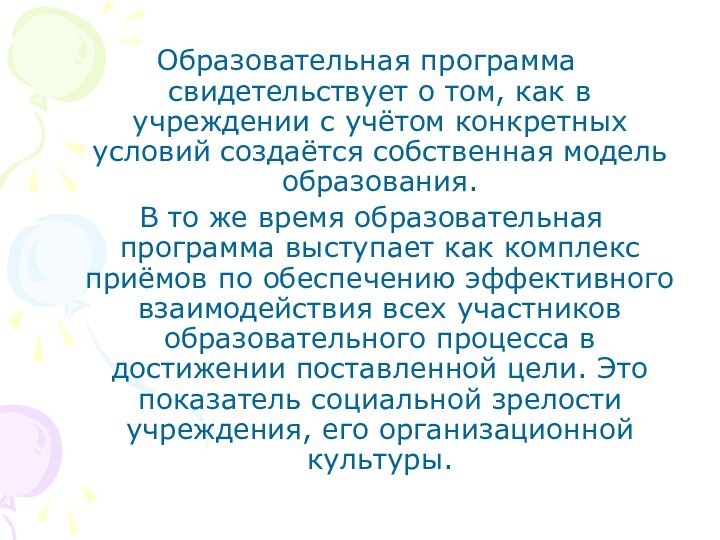 то же время образовательная программа выступает как комплекс приёмов по обеспечению эффективного взаимодействия всех участников образовательного процесса в достижении поставленной цели. Это показатель социальной зрелости учреждения, его организационной культуры.