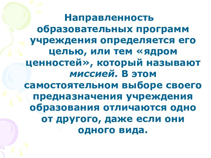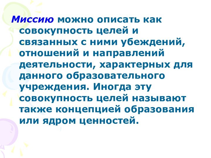 данного образовательного учреждения. Иногда эту совокупность целей называют также концепцией образования или ядром ценностей.