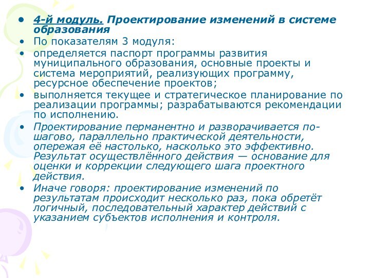 Иначе говоря: проектирование изменений по результатам происходит несколько раз, пока обретёт логичный, последовательный характер действий с указанием субъектов исполнения и контроля.